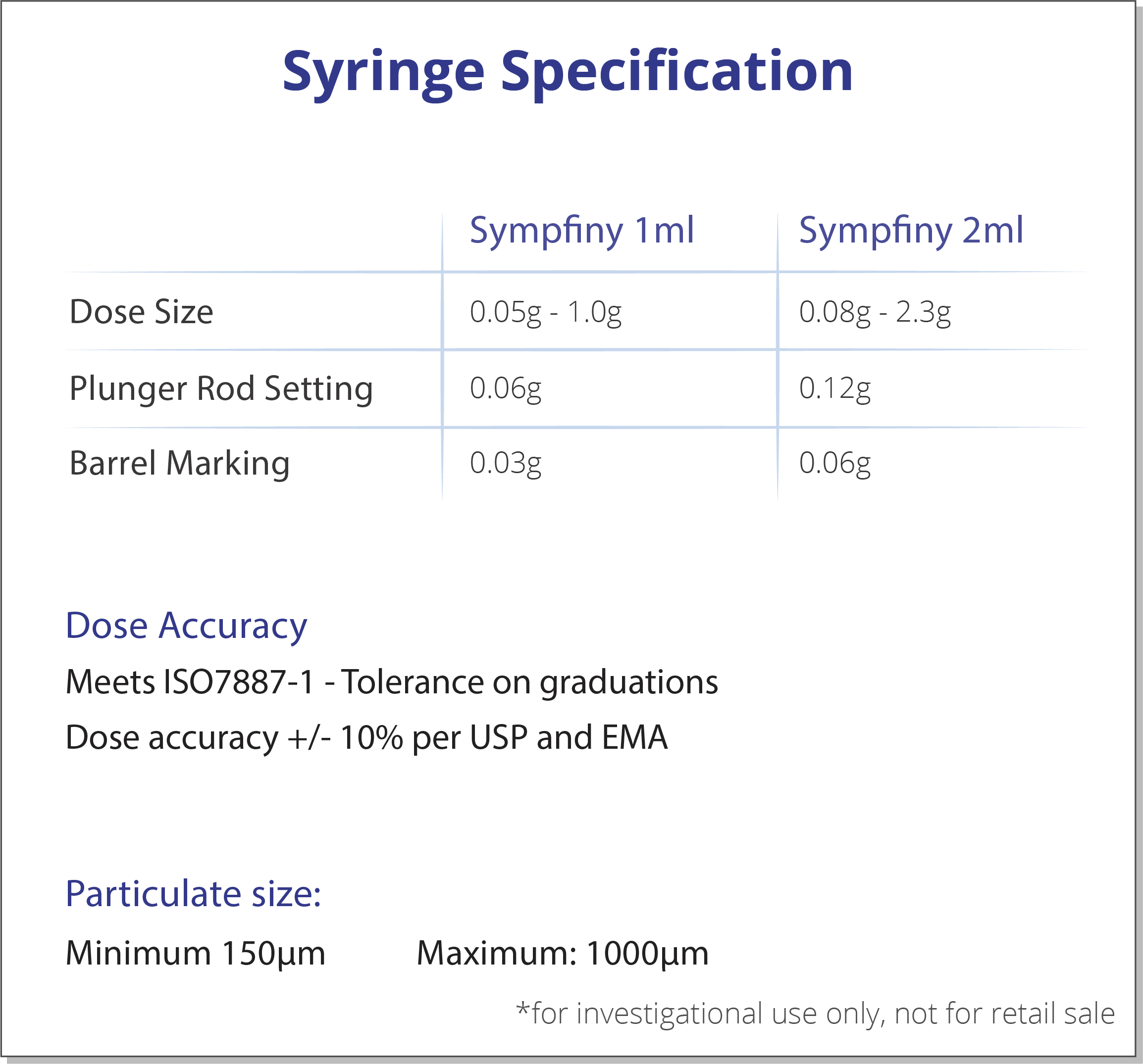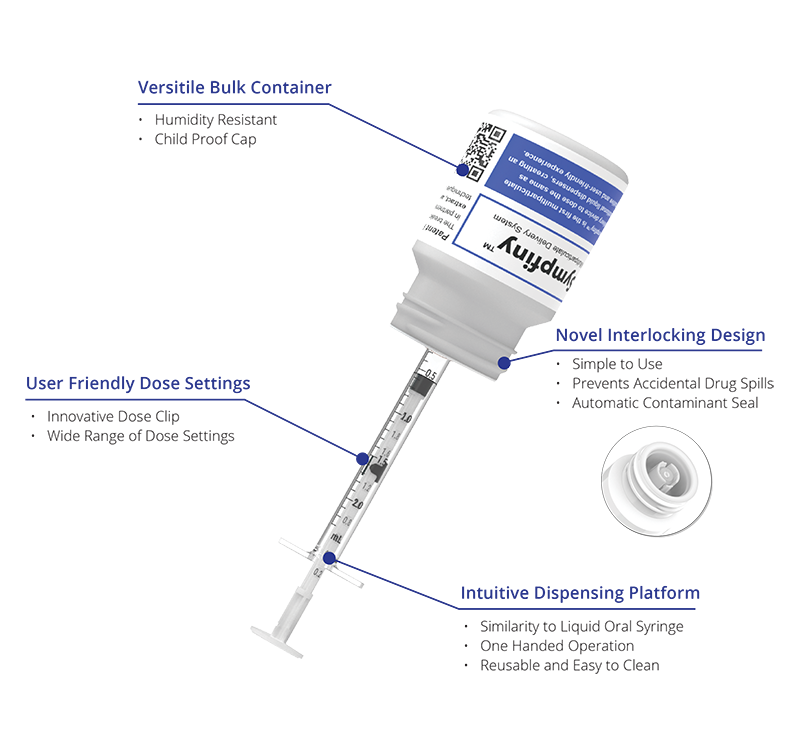 Sympfiny™ is an innovative oral delivery system for dosing and dispensing dry powder, microsphere, and multiparticulate and mini-tab drug formulations.